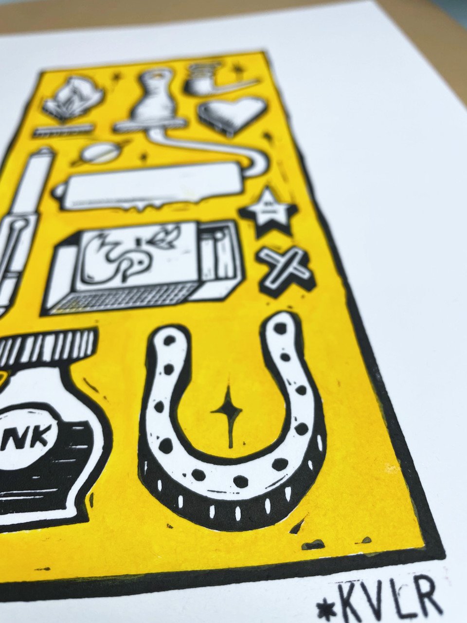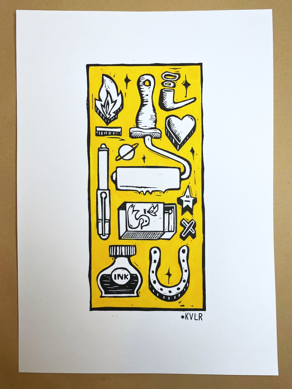 Lino cut print with hand painted acrylic ink on 300gsm watercolour paper.